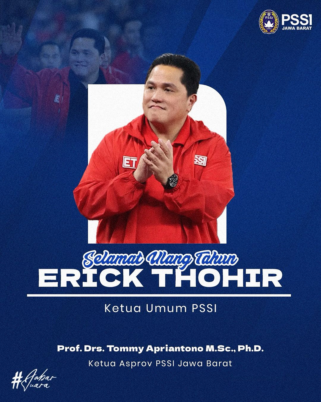 Bandung, 30 Mei 2025 — Asosiasi PSSI Provinsi Jawa Barat menyampaikan ucapan selamat ulang tahun kepada Ketua Umum PSSI, Erick Thohir, yang merayakan hari lahirnya pada hari ini, 30 Mei.