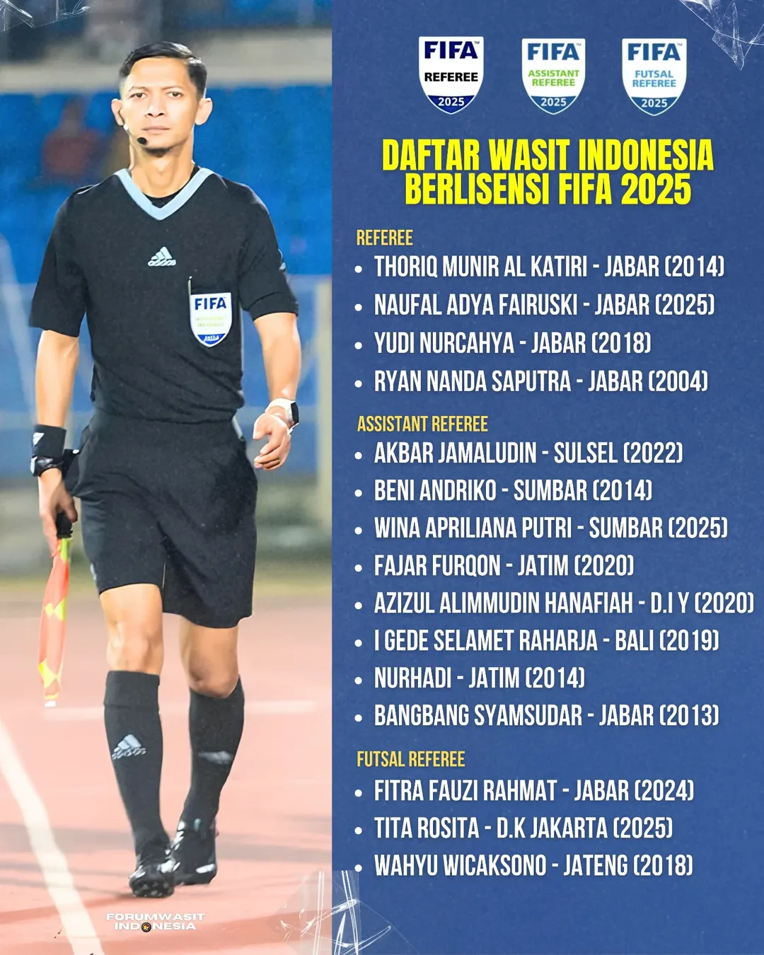 6 Fitra Fauzi Rahmat – Mewakili Jawa Barat di kategori Futsal Referee, Fitra mulai memegang lisensi FIFA sejak 2024 dan masuk daftar resmi untuk 2025.